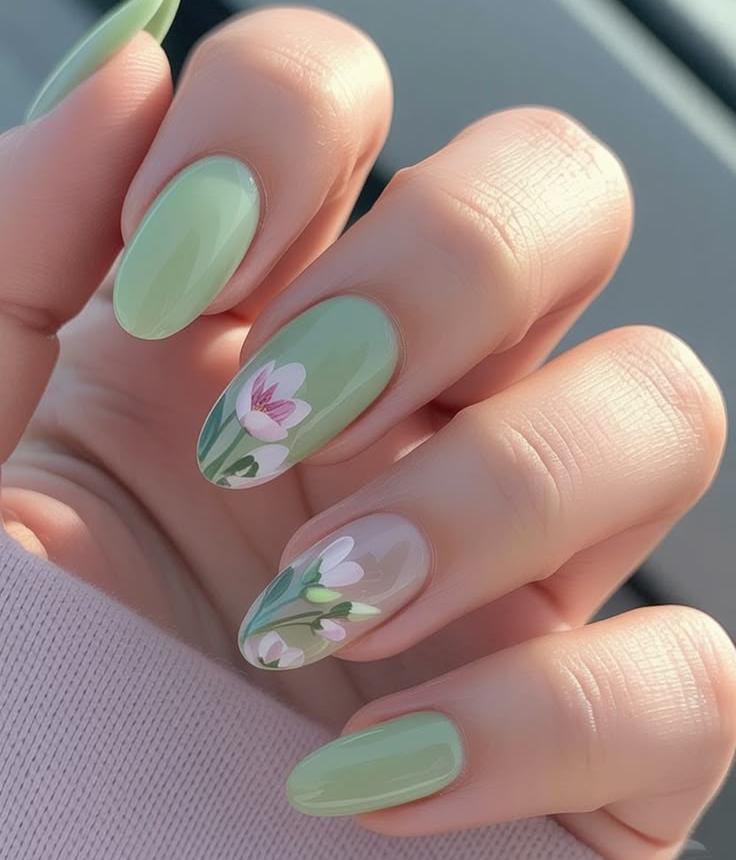 Muted sage green gel nails are paired with soft pink floral accents and delicate blossom details. The overall look feels elegant, fresh, and inspired by April spring flowers in bloom.