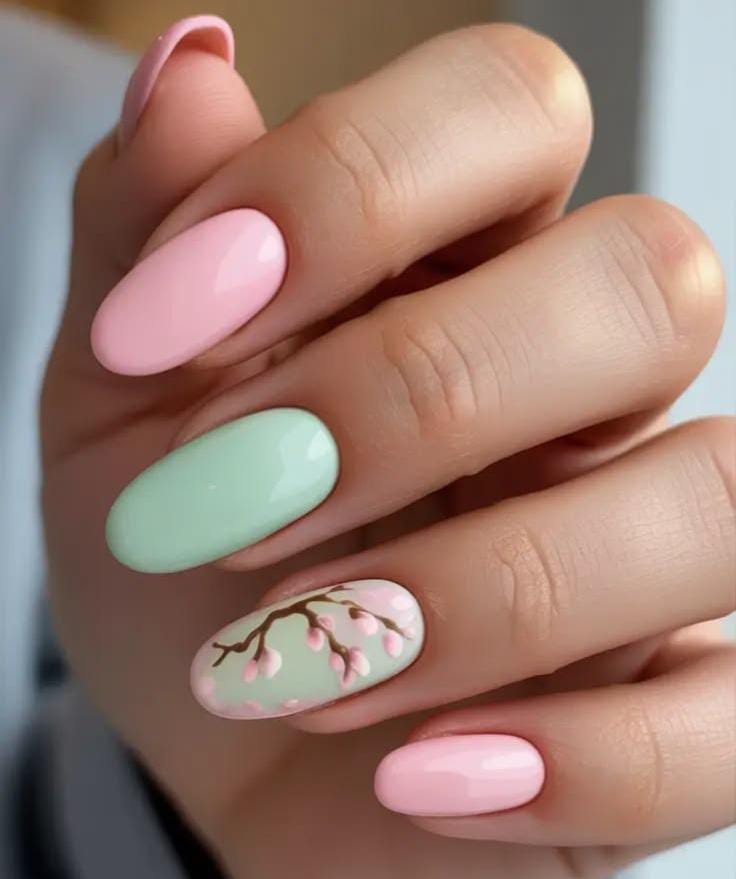 Glossy pastel pink and mint green gel nails are paired with a delicate cherry blossom branch accent nail. The look is soft, elegant, and inspired by the calm beauty of April spring blossoms.