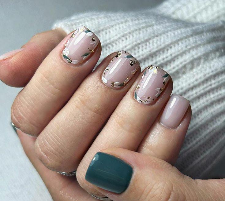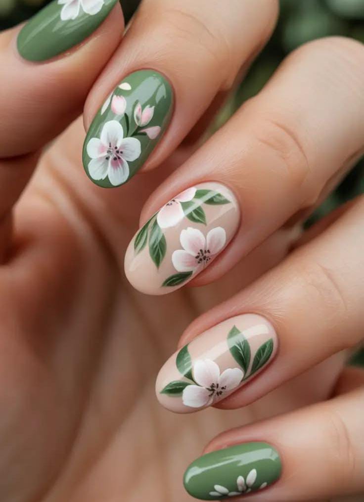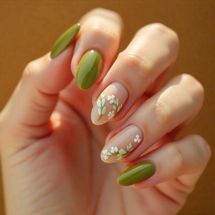 This design combines glossy olive green gel nails with nude accents decorated with tiny white flowers and leafy details. The look feels fresh and botanical, perfect for a soft and natural April-inspired style.