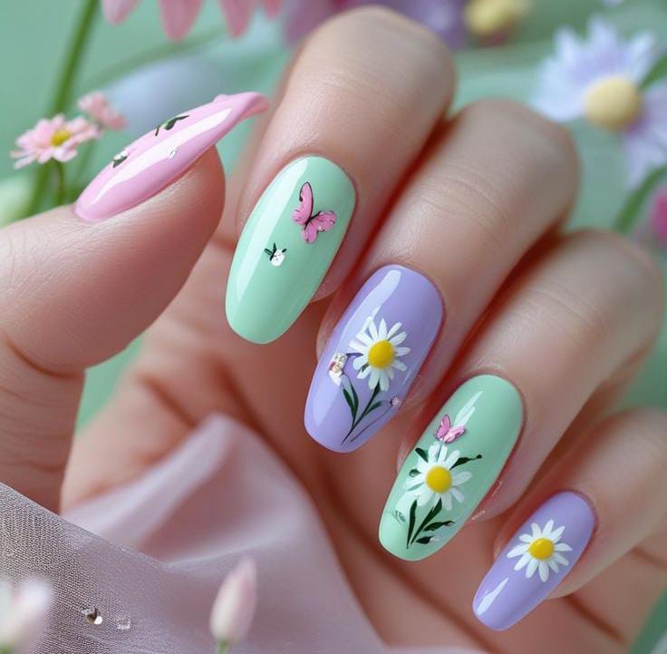 Soft pastel gel shades of mint, lavender, and pink create a playful spring palette decorated with daisies and tiny butterflies. The design feels light, cheerful, and perfectly inspired by blooming April gardens.