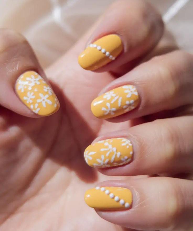 Bright yellow gel nails are decorated with simple white daisy patterns and tiny raised dotted accents. The cheerful color and playful flowers give the design a fun and lively April vibe.