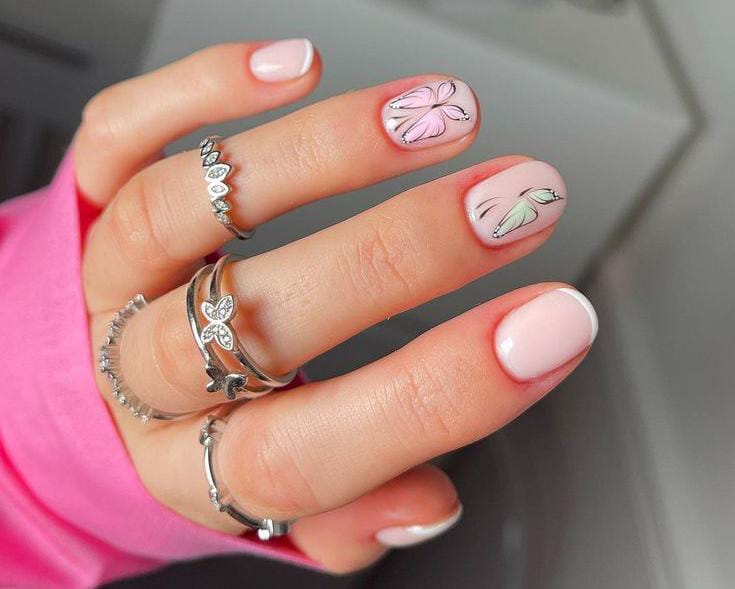 These gel nails feature a soft natural base with delicate butterfly illustrations that create a light, airy spring vibe. The minimal white French tips add a clean and elegant touch to the gentle pastel April design.
