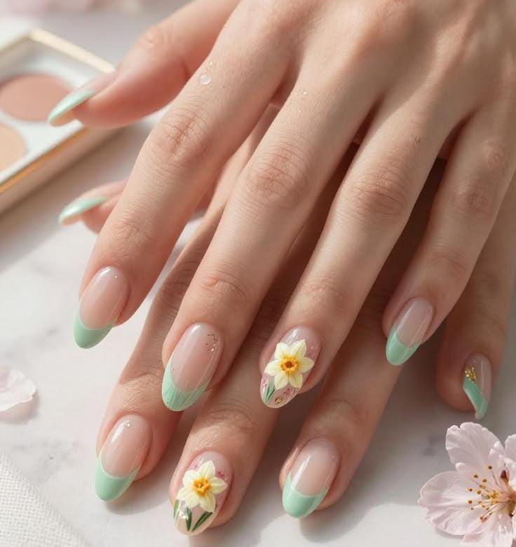 These gel nails feature a nude base with soft mint green French tips that give the design a fresh and airy spring feel. A few accent nails include delicate daisy flowers and subtle gold details for a charming April-inspired look.