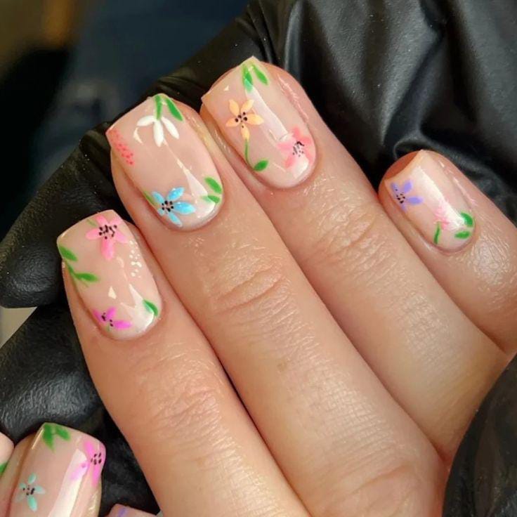 This design has a glossy nude gel base decorated with tiny colorful flowers and green leaves scattered across each nail. The playful mix of pastel blossoms creates a cheerful and lively April spring garden vibe.
