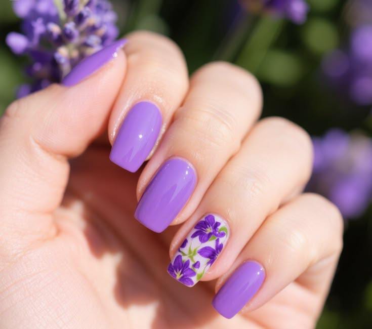 Bright lavender gel nails are paired with an accent nail featuring detailed purple floral artwork. The style looks fresh, vibrant, and inspired by blooming April spring flowers.