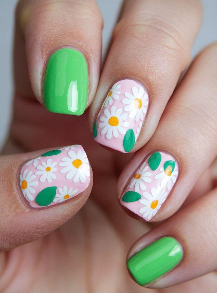 Bright green gel nails pair with soft pink nails decorated with tiny white daisies and leafy accents. The design feels cheerful and fresh, giving a playful spring garden vibe perfect for April.