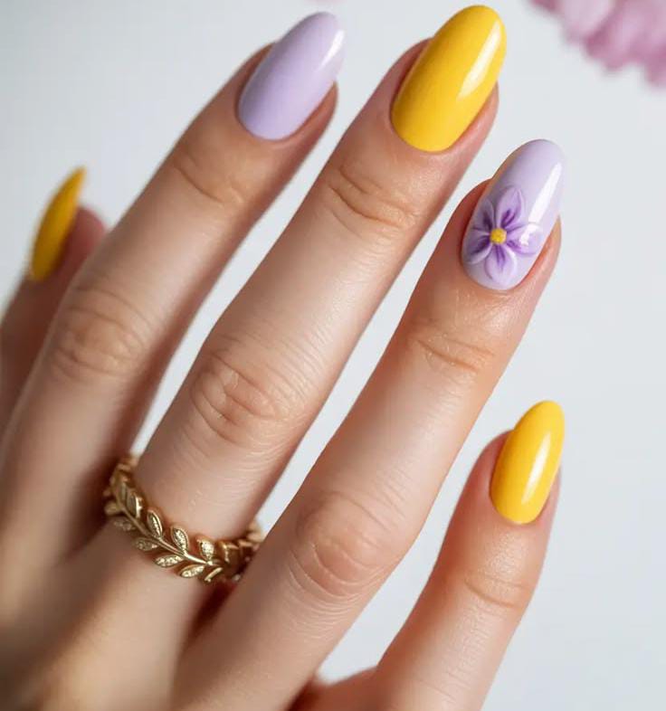 Soft lavender and bright yellow gel nails create a cheerful spring color combination. A single purple flower accent adds a delicate and fresh, easy April-inspired touch.