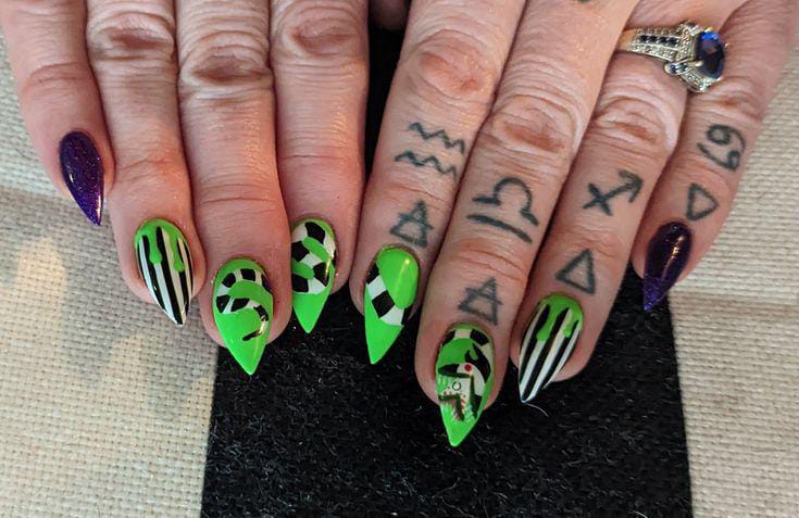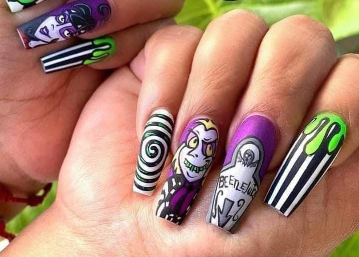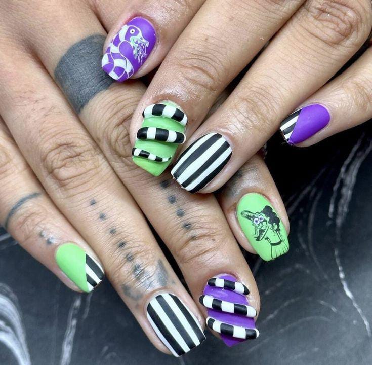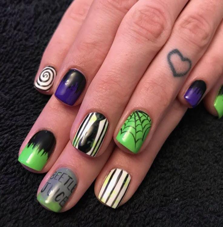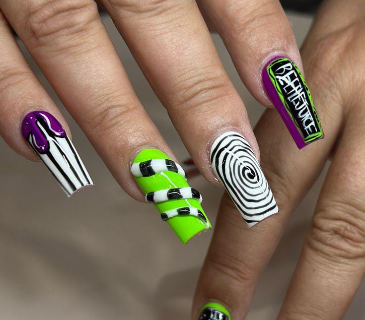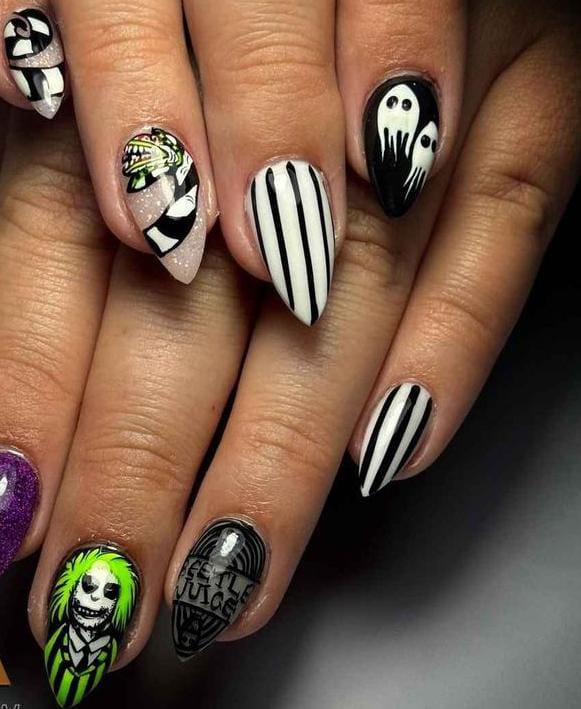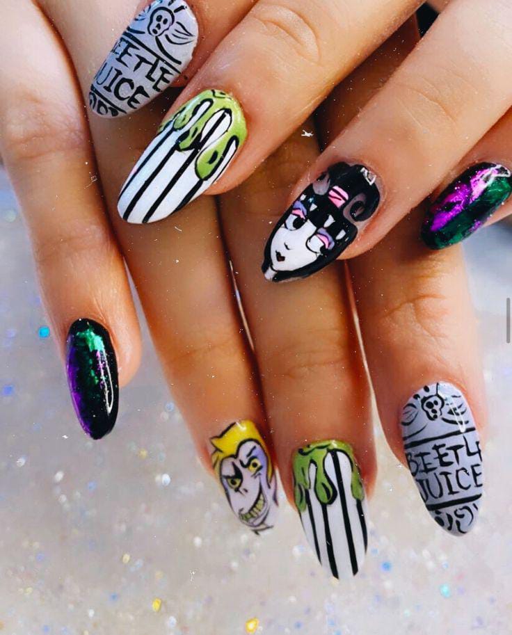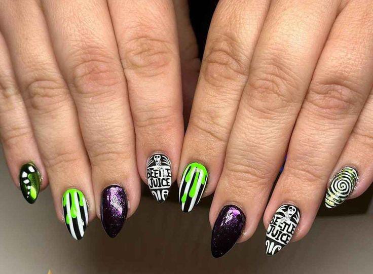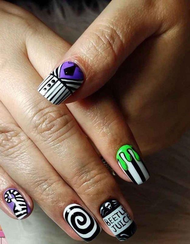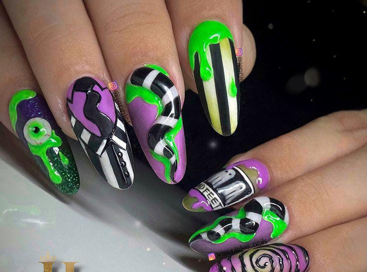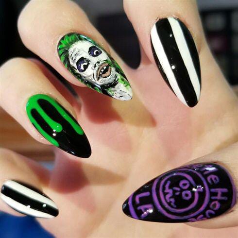 Striped black and white nails with flowing green slime and bright purple nails featuring cartoon-style Beetlejuice art and fun Halloween patterns.