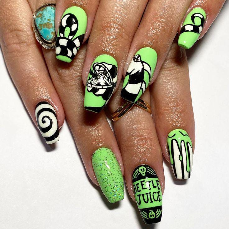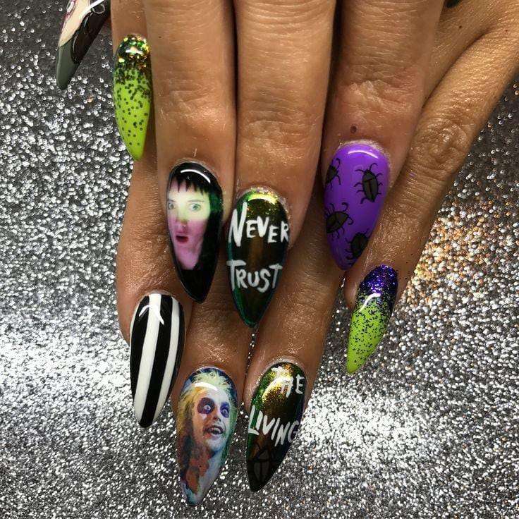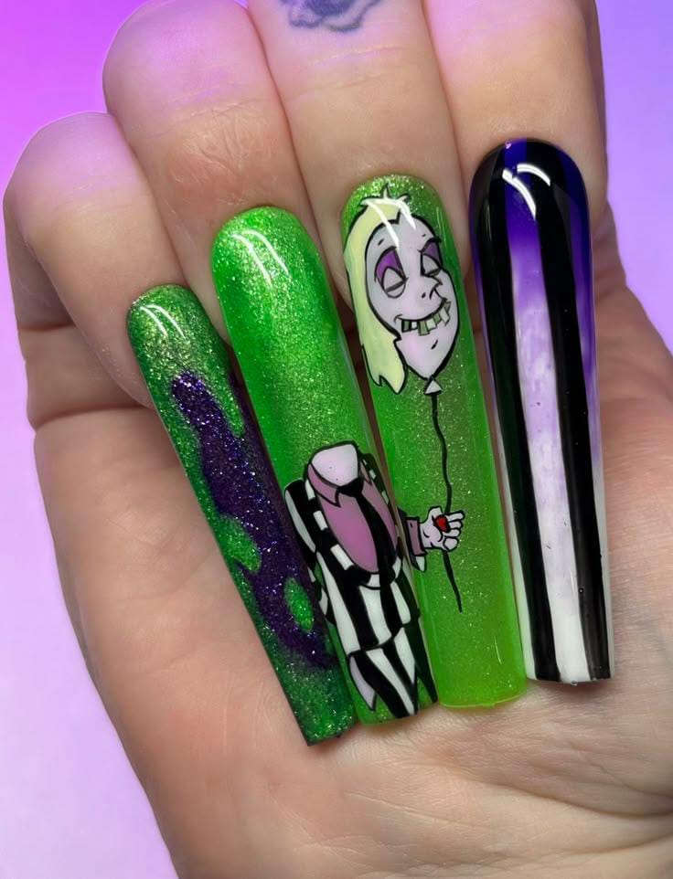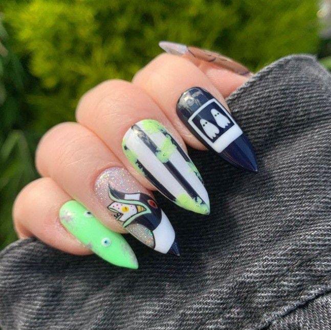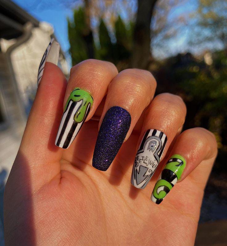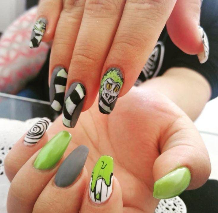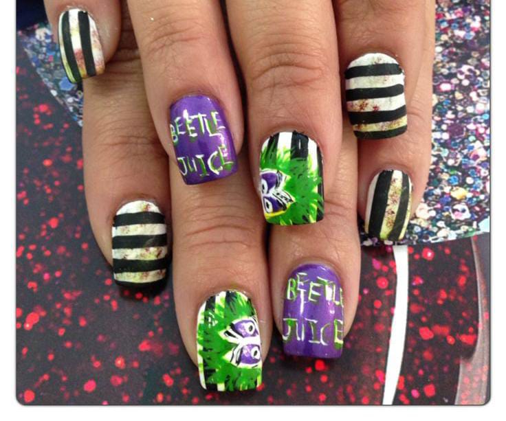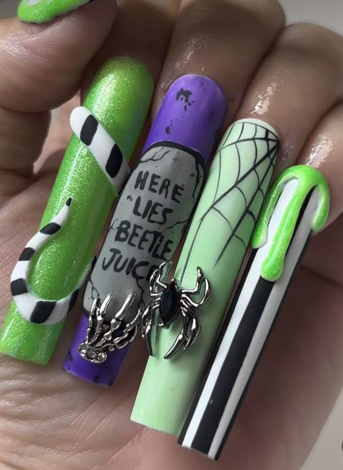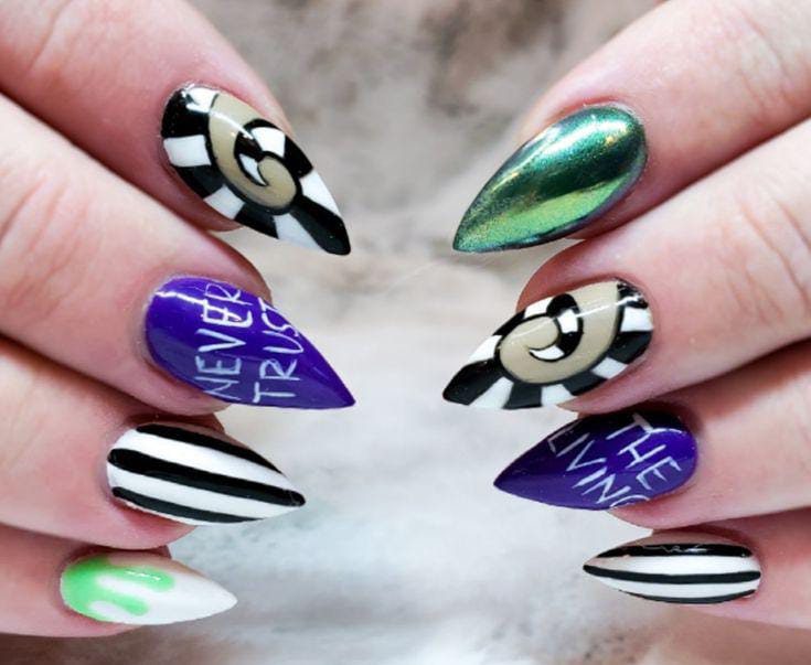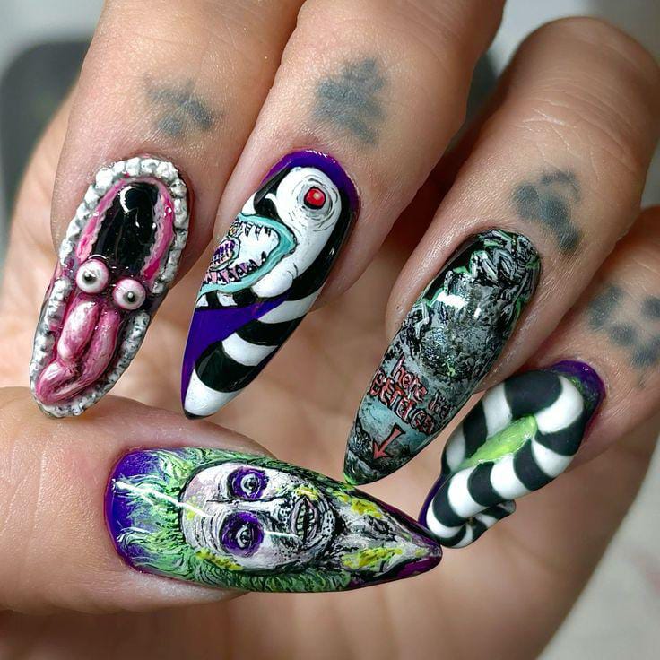 Striped black and white nails with flowing green slime and bright purple nails featuring cartoon-style Beetlejuice art and fun Halloween patterns.