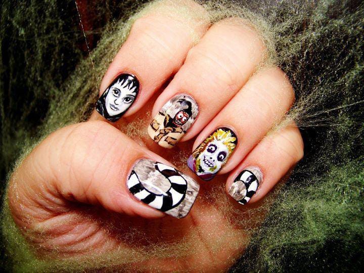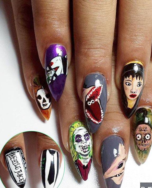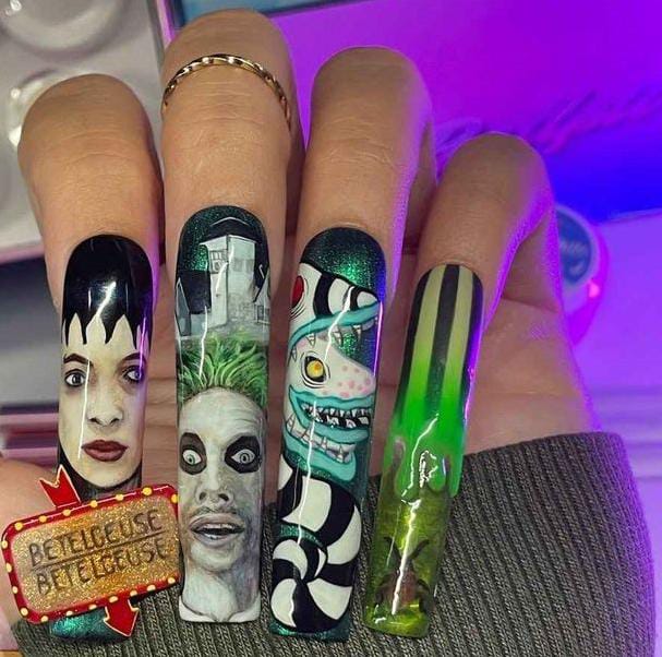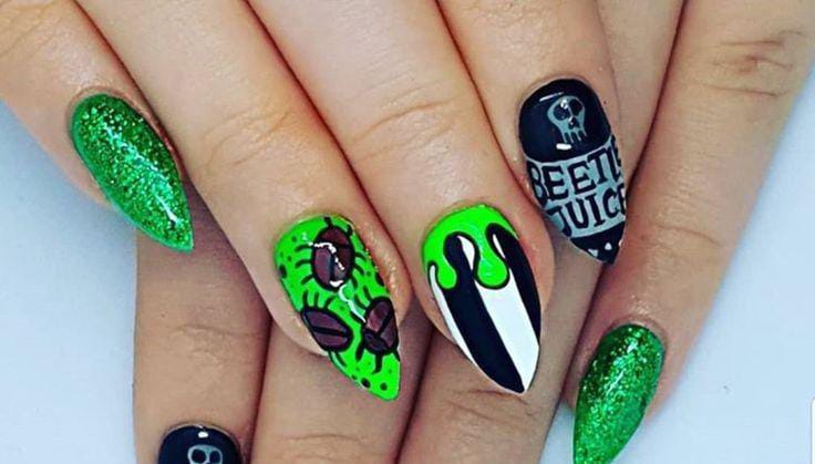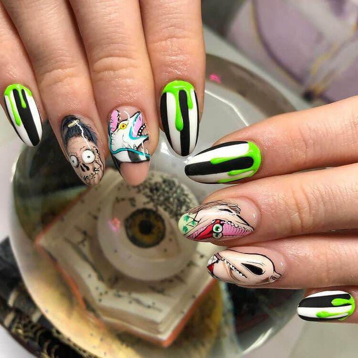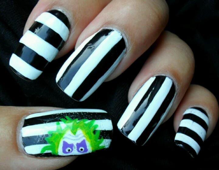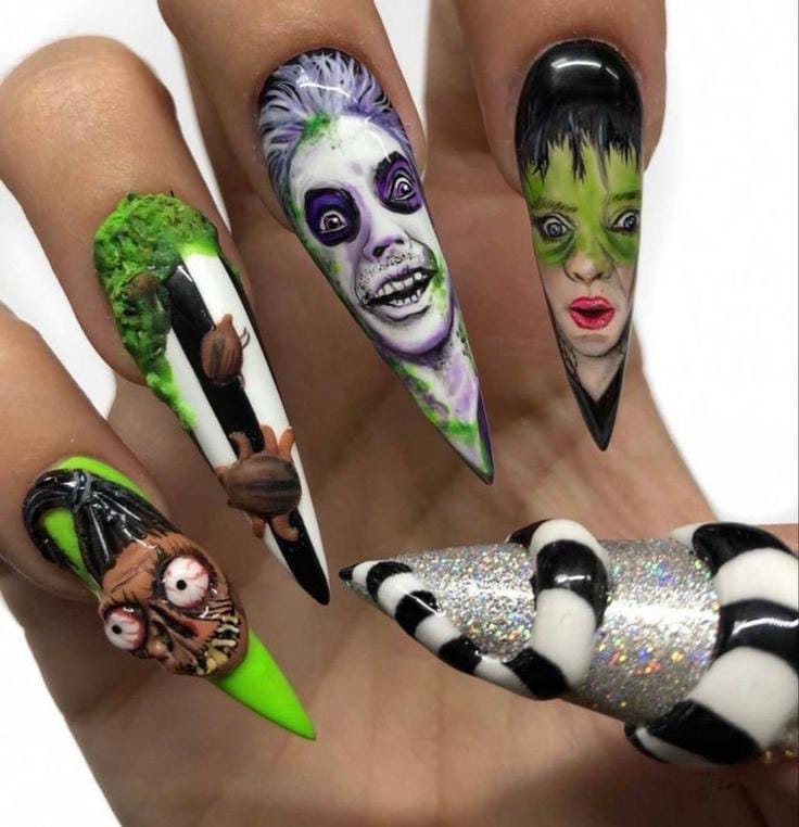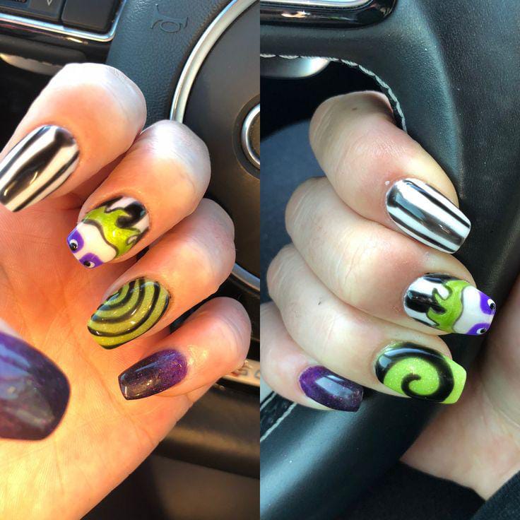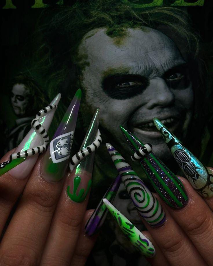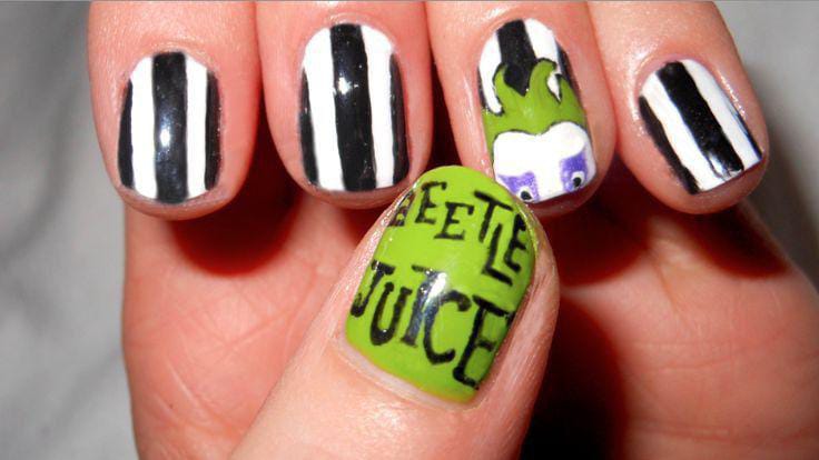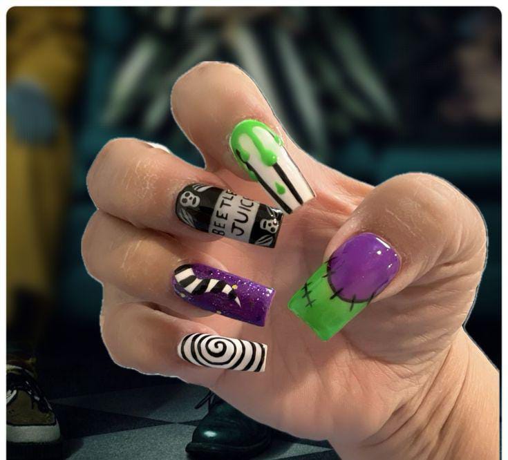 Striped black and white nails with flowing green slime and bright purple nails featuring cartoon-style Beetlejuice art and fun Halloween patterns.