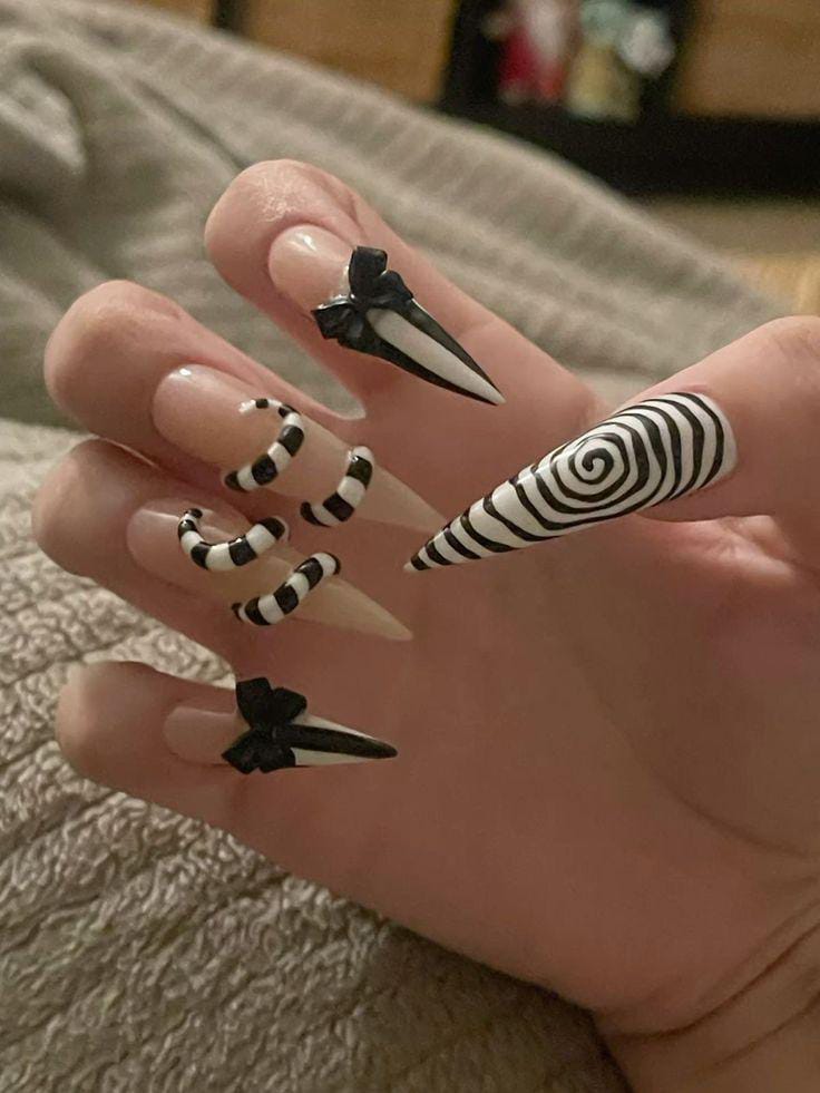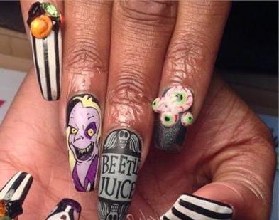 Spooky nails never go out of style, and Beetlejuice-inspired designs prove it every time.