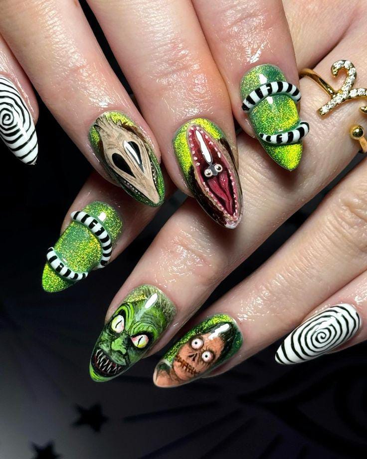 A bold design featuring detailed hand-painted Beetlejuice-inspired faces and monsters on shimmering green nails with sandworm.