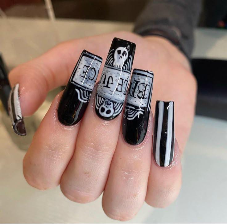 Glossy black square nails showcasing the Beetlejuice tombstone design with eerie monochrome detailing.