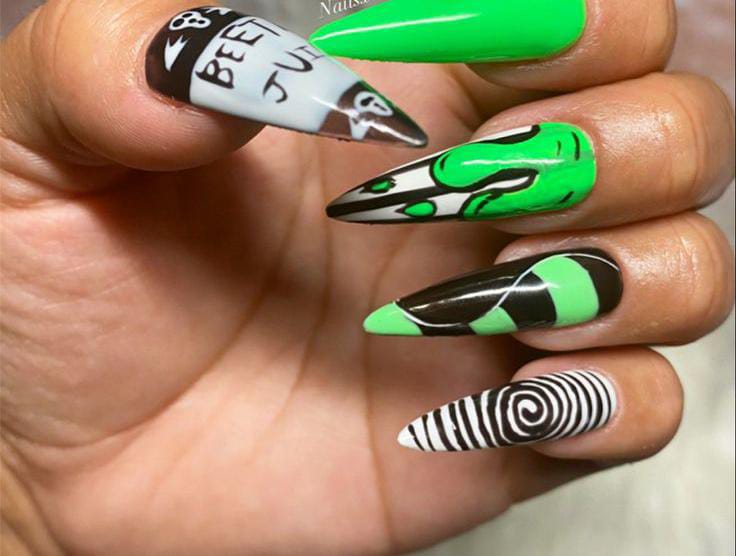 A mix of matte black, lime green, spirals, sandworm and Beetlejuice’s eerie face for a striking, edgy finish.