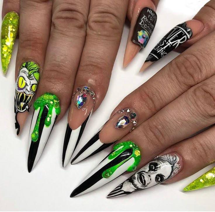 Sharp stiletto nails with black-and-white stripes, neon green slime, and Beetlejuice-inspired faces for a bold, creepy vibe.