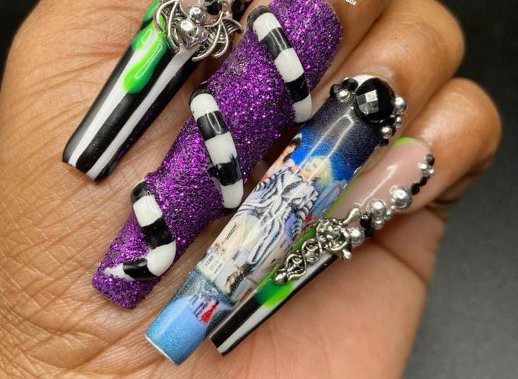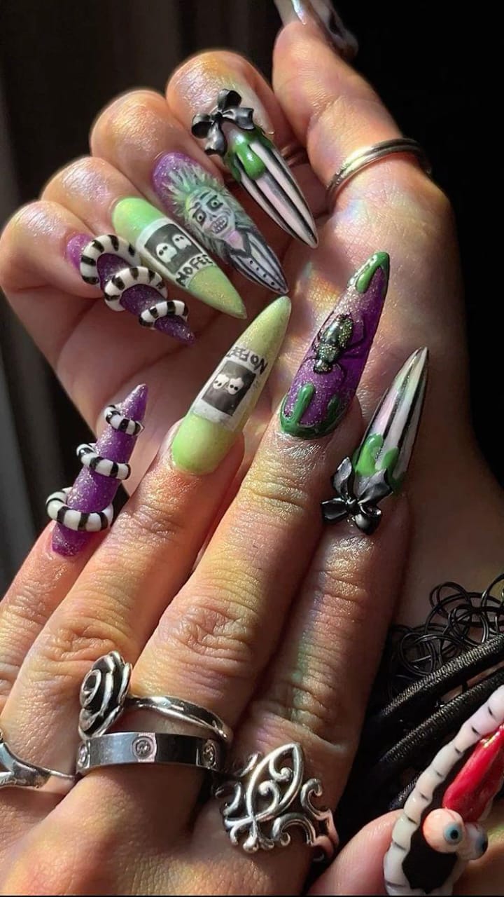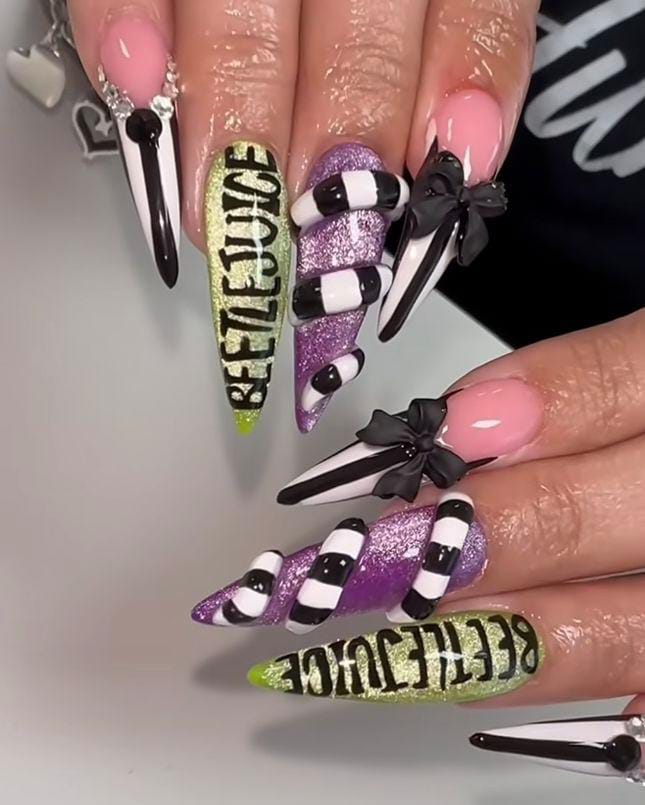 Long nails with purple, green, and striped patterns mixed with 3D details like sandworm and bows, giving a playful yet eerie Beetlejuice look.