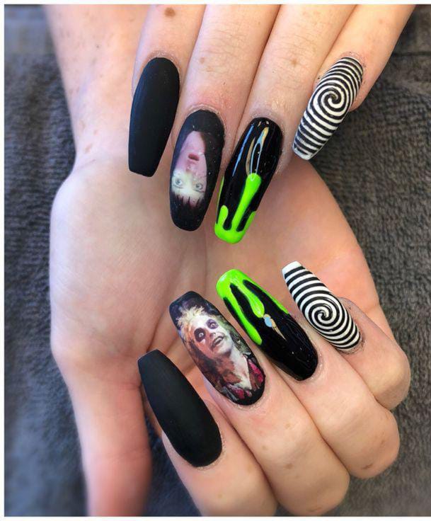 Matte black nails mixed with neon slime drips, character portraits, and hypnotic swirls for a spooky yet stylish Beetlejuice vibe.