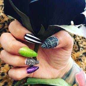 Long, pointed nails decked out in glowing green, purple, spirals and snadworms for a dramatic Beetlejuice effect.