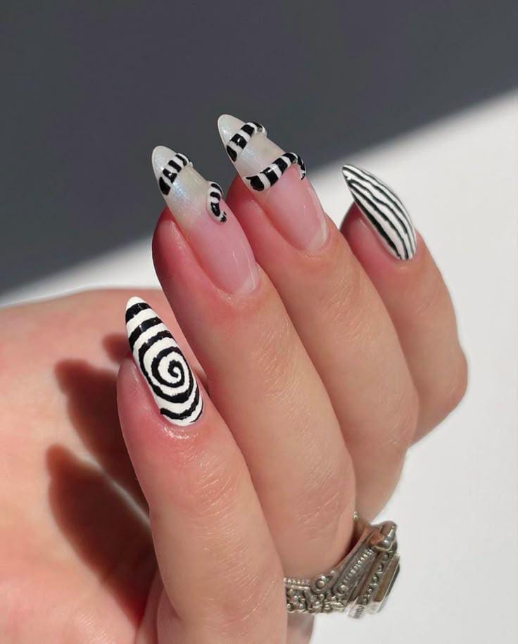 Almond nails with bold black-and-white stripes and sandworm, giving a trippy, hypnotic vibe.