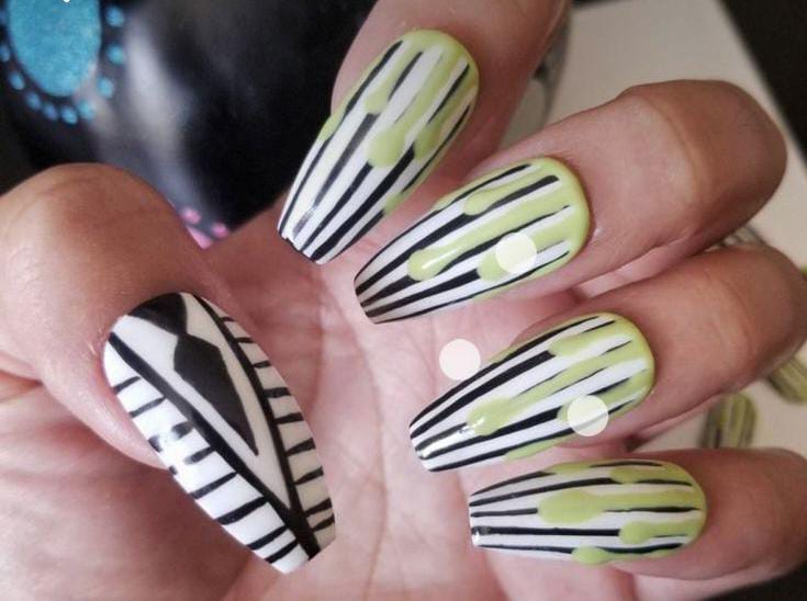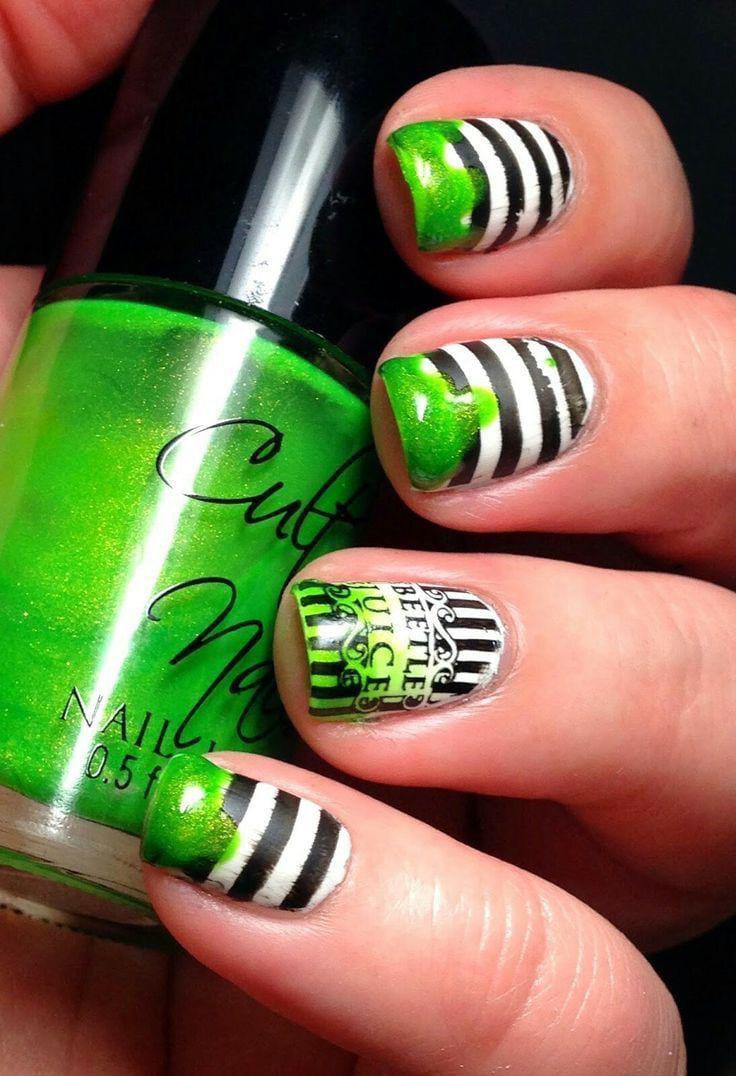 Striped nails with pops of bright green polish and Beetlejuice-inspired lettering, blending creepy with playful.