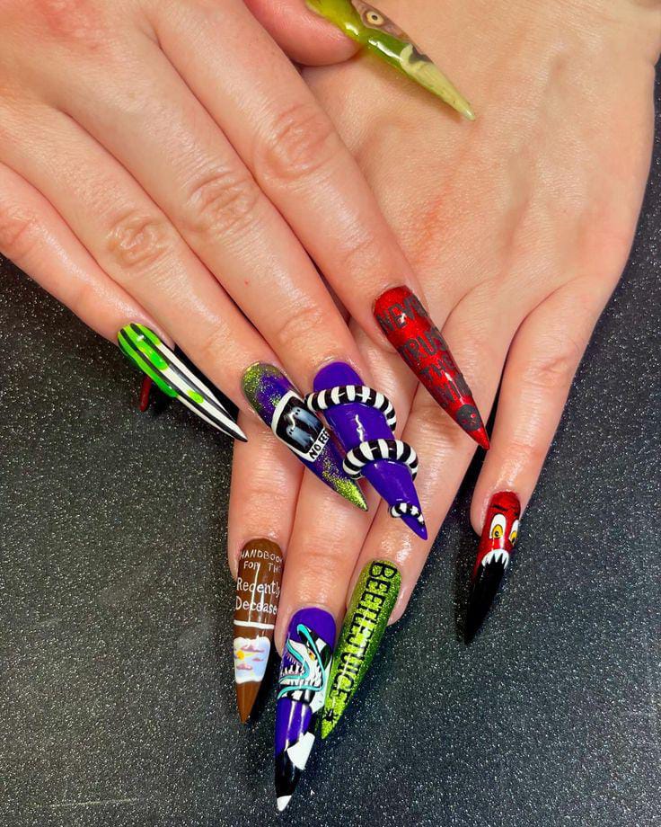 Extra-long stiletto nails packed with Beetlejuice references—sandworm, creepy faces, bold colors, and even the “Handbook for the Recently Deceased”—making them a true statement set.
