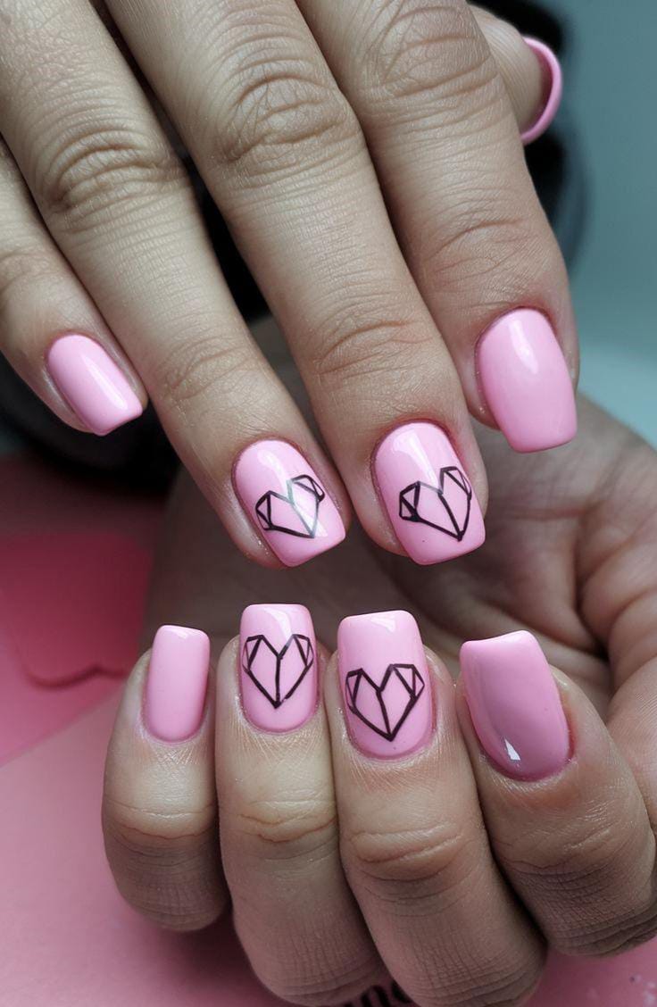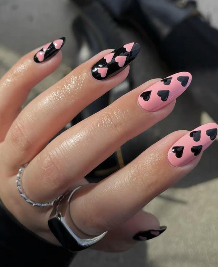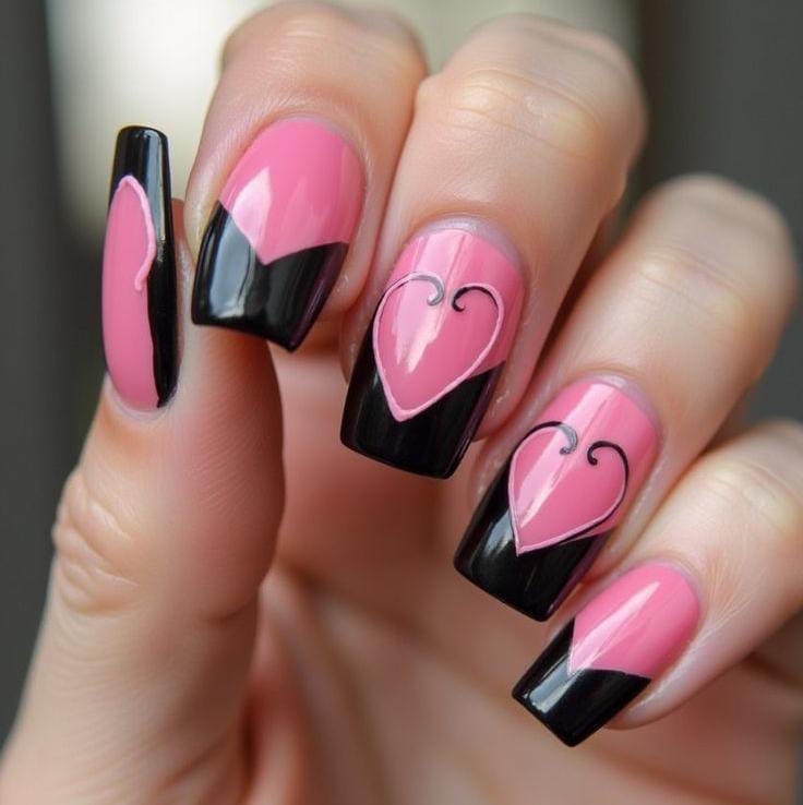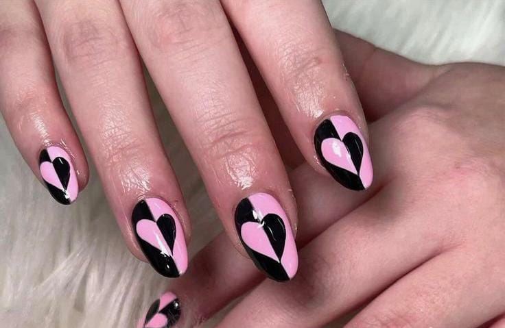 Pink and black polish combine to form heart shapes across the nails in a balanced, eye-catching way. The design feels romantic yet classy, with a polished Valentine’s finish.