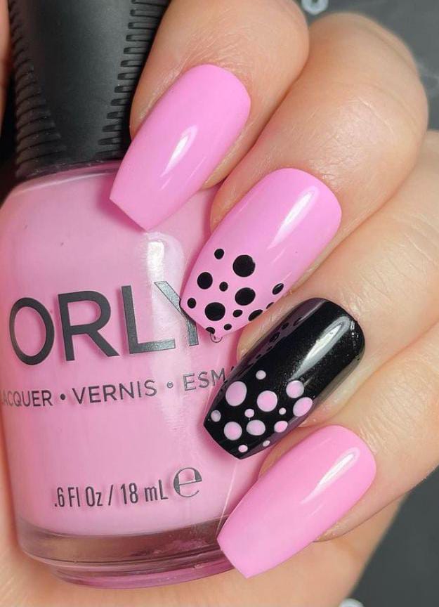 Light pink and black nails are combined with playful polka dots for a cute, retro vibe. The contrast keeps the design fun, fresh, and Valentine-ready.