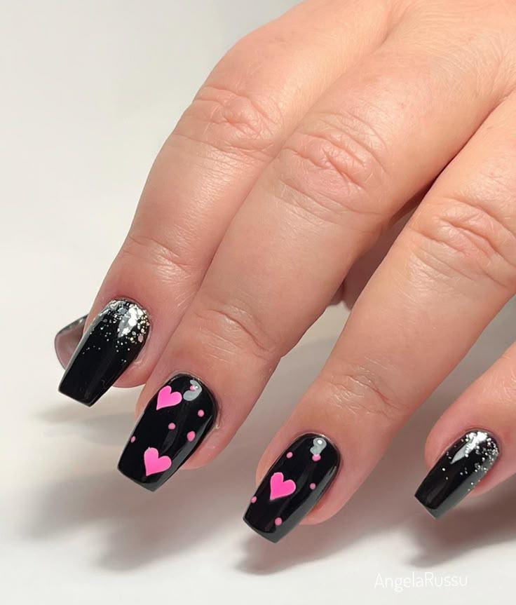 This design features glossy black nails decorated with bright pink hearts, some shimmer and tiny dots for a playful Valentine vibe. The contrast feels bold, cute, and eye-catching.