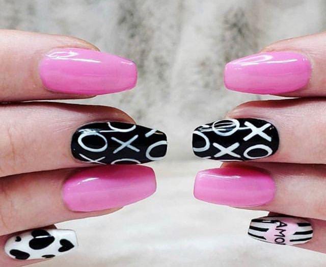 Soft pink nails are paired with black accent nails covered in white XOXO patterns. The look feels fun, romantic, and modern with a graphic Valentine’s touch.