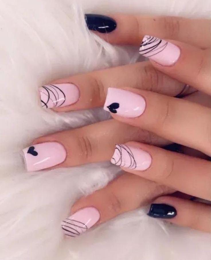 A soft pink base is paired with black hearts and simple stripe details across the nails. The overall look is cute, sweet, and slightly retro with a cozy Valentine charm.