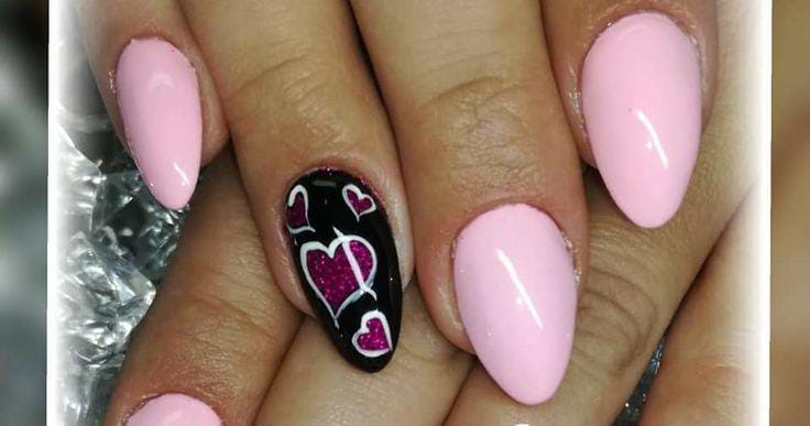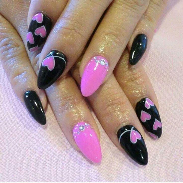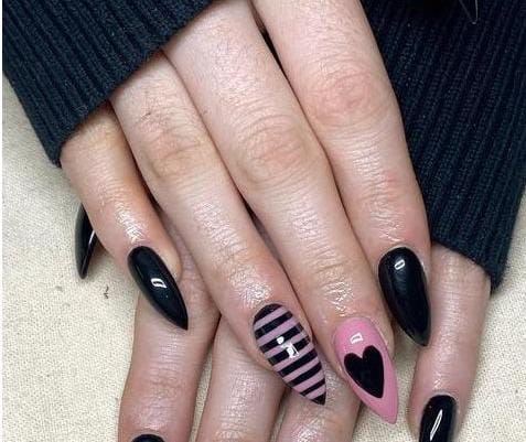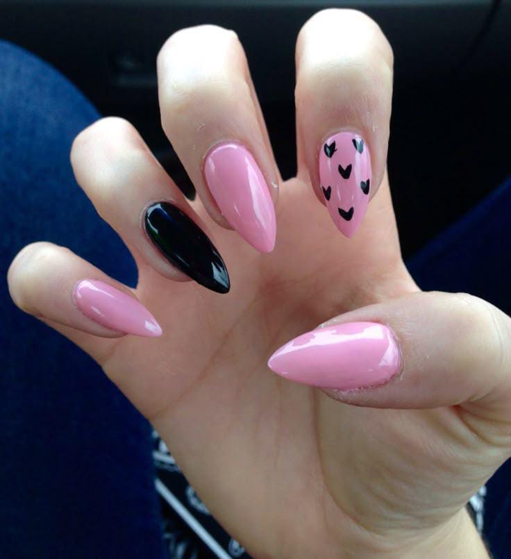 This design mixes soft pink and glossy black nails with tiny heart accents for a playful Valentine vibe. The pointed shape adds a bold edge while keeping the look romantic.