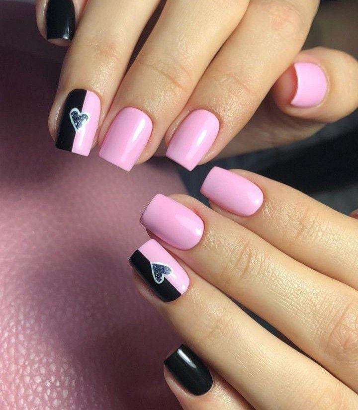 Soft matte pink and black nails create a modern, edgy Valentine look. Simple heart designs keep it romantic while still feeling clean and stylish.