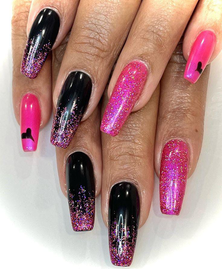 This design mixes glossy black nails with hot pink glitter for a bold, glamorous vibe. The sparkle adds a playful Valentine’s feel while keeping the look edgy and confident.