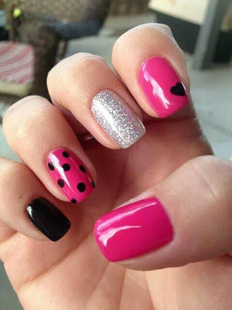 Bright pink nails are paired with black accents, dots, a tiny heart and a touch of silver glitter for extra shine. The overall vibe is fun, flirty, and perfect for Valentine’s celebrations.
