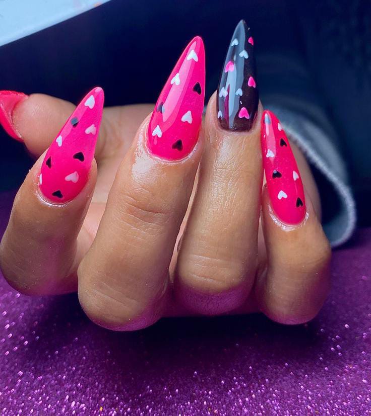 Bright pink and black nails are covered with small scattered heart patterns for a fun, youthful look. The design feels lively, bold, and full of Valentine’s energy.