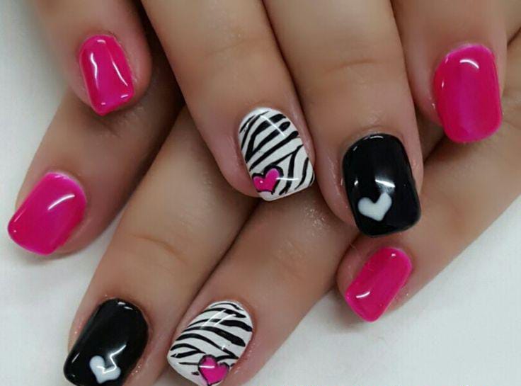 Bright pink and black nails are paired with zebra stripes and small heart details for a trendy Valentine’s look. The design feels bold, youthful, and eye-catching.