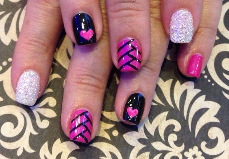 Pink and black nails are combined with glitter accents, heart details, and striped patterns. The design feels festive, fun, and full of Valentine energy.