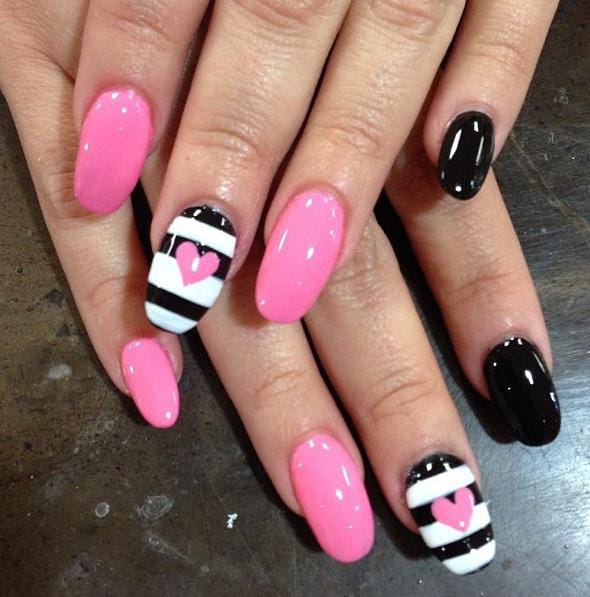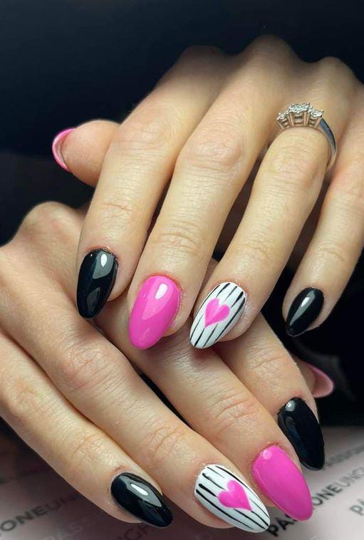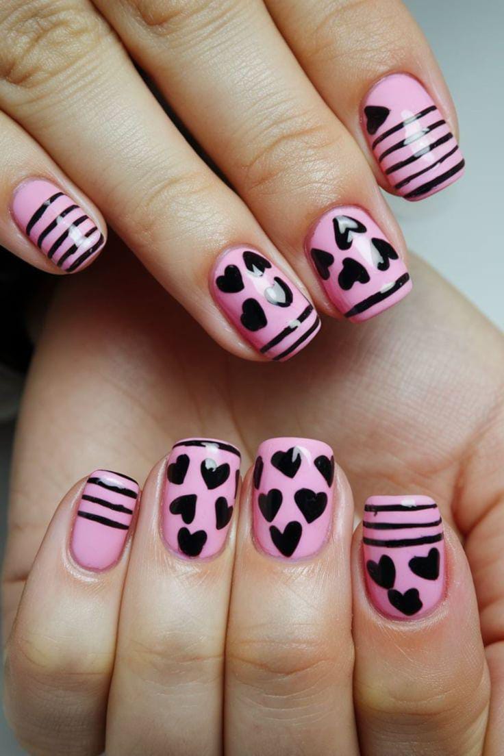 Black and pink nails combine solid colors with striped patterns and heart details. The design feels edgy yet romantic, with a trendy Valentine mood.