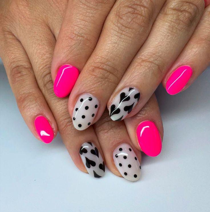 Hot pink nails are paired with soft nude bases featuring black polka dots and tiny heart patterns. It feels fun, flirty Valentines, and lighthearted while still keeping a polished look.