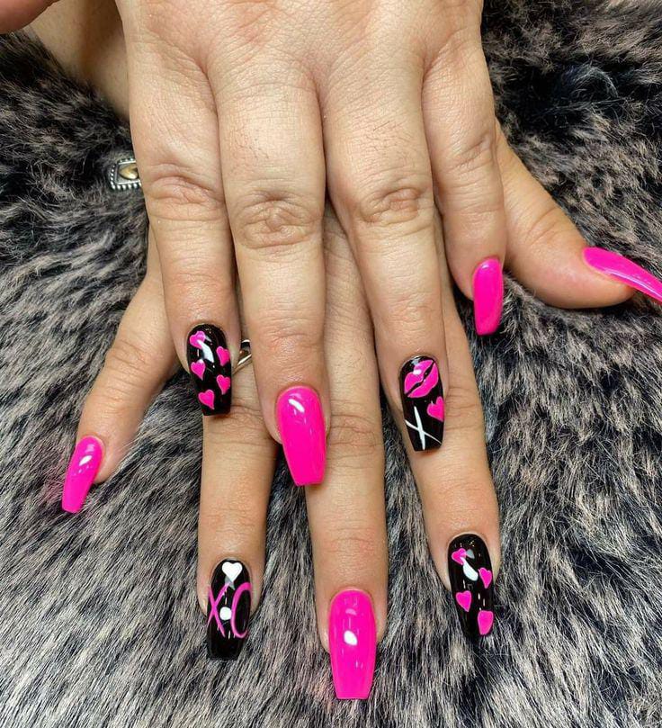 This design mixes bright pink, glossy black, and soft white for a bold Valentine look. Heart accents add a playful, romantic vibe without feeling too busy.