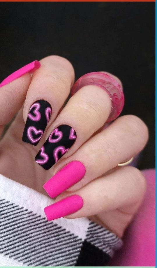 Matte pink nails contrast with black accent nails with glowing neon pink heart designs. The style feels trendy and edgy, perfect for a modern Valentine’s Day look.