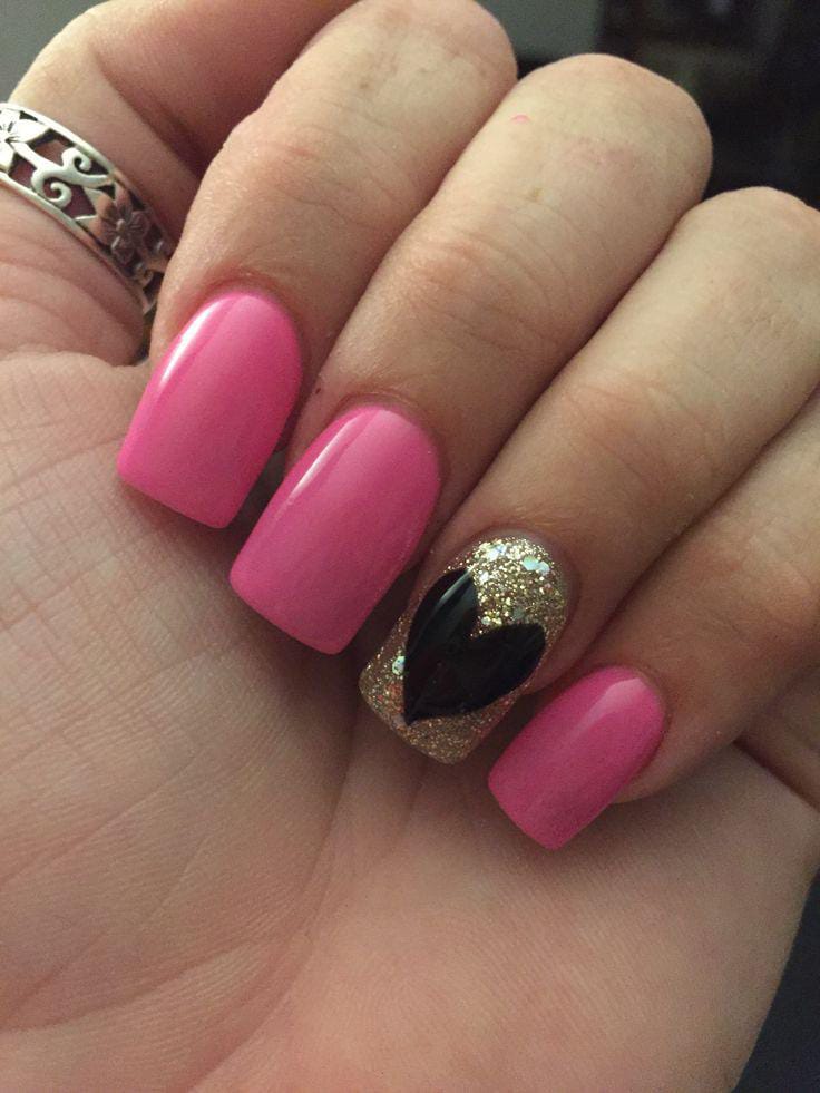 This design features glossy hot pink nails paired with a bold black accent nail framed by gold glitter. The look feels glamorous and playful, perfect for a statement Valentine vibe.