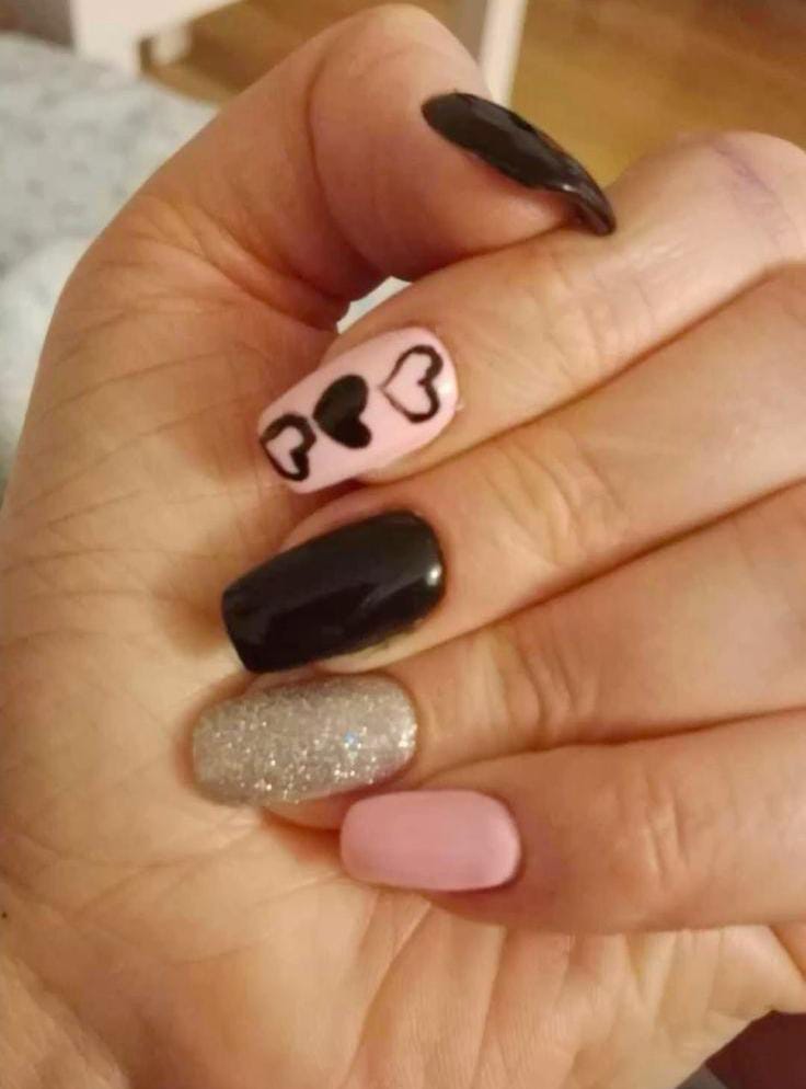 Soft pink, black, and silver glitter nails come together with simple heart art on a pale pink base. The overall style is cute, balanced, and romantic Valentines without being too bold.