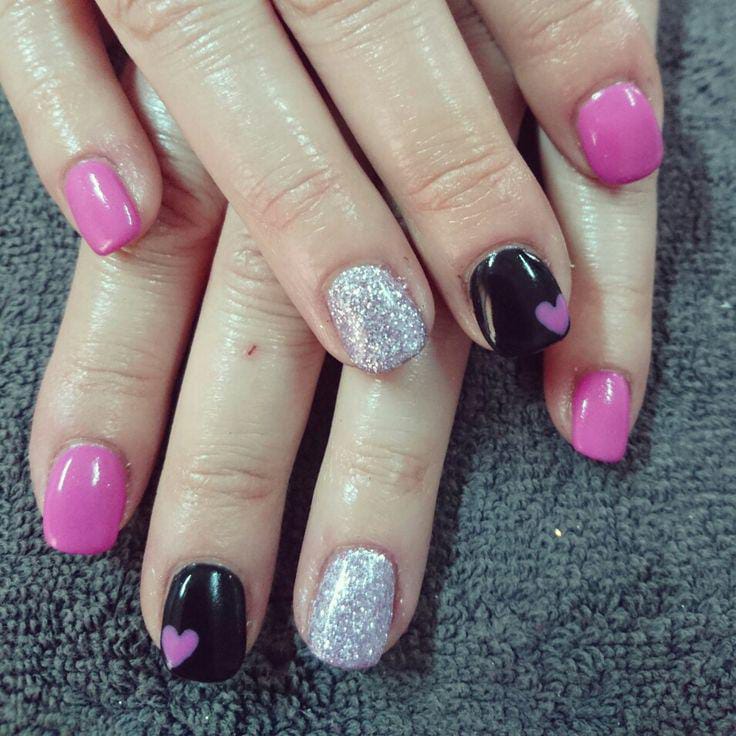 This design mixes hot pink and glossy black nails with silver glitter accents and tiny heart details. It feels classic, elegant, and sweet Valentines with just the right amount of sparkle.