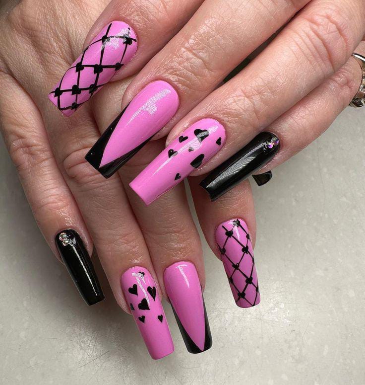 Bright pink coffin nails are decorated with hand-drawn black hearts and graphic accents, mixed with sleek black statement nails. The vibe is edgy, fun, and very eye-catching for Valentine’s Day.