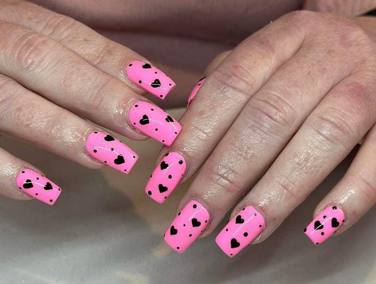Bright pink nails are decorated with scattered black hearts and tiny dots for a playful, flirty feel. The overall style is fun, youthful, and classic Valentine-ready.