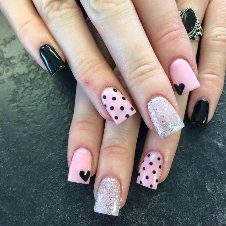 Soft pink and black nails are balanced with polka dots, tiny heart details, and a touch of silver glitter. The look feels cute Valentines and feminine with a hint of sparkle and contrast.