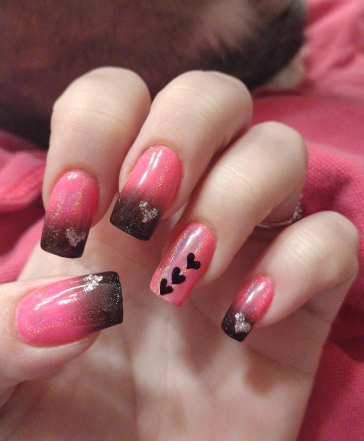 This design blends pink into black with a subtle ombré effect, finished with glitter accents and small heart details. It gives off a warm, romantic Valentine’s vibe with a slightly dramatic twist.