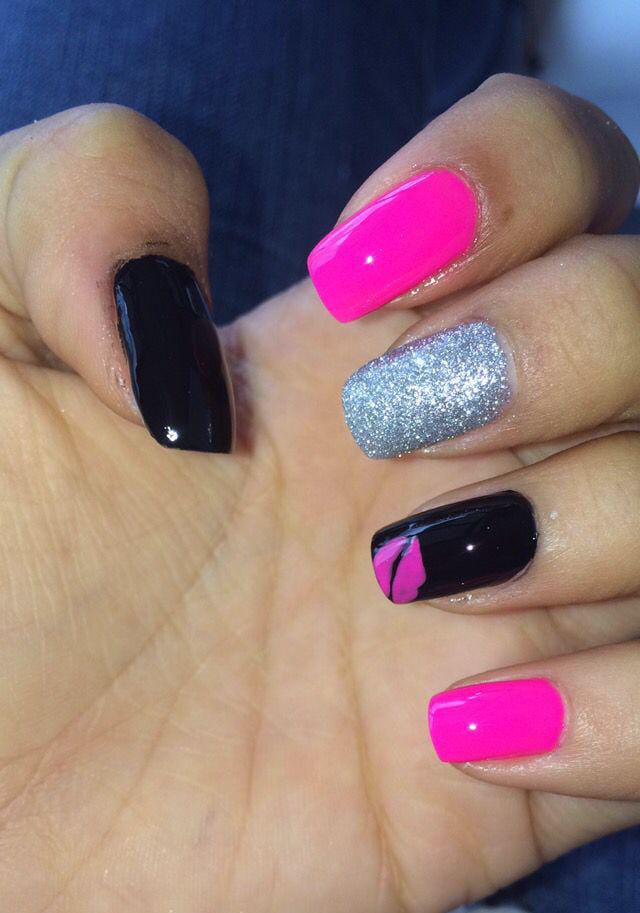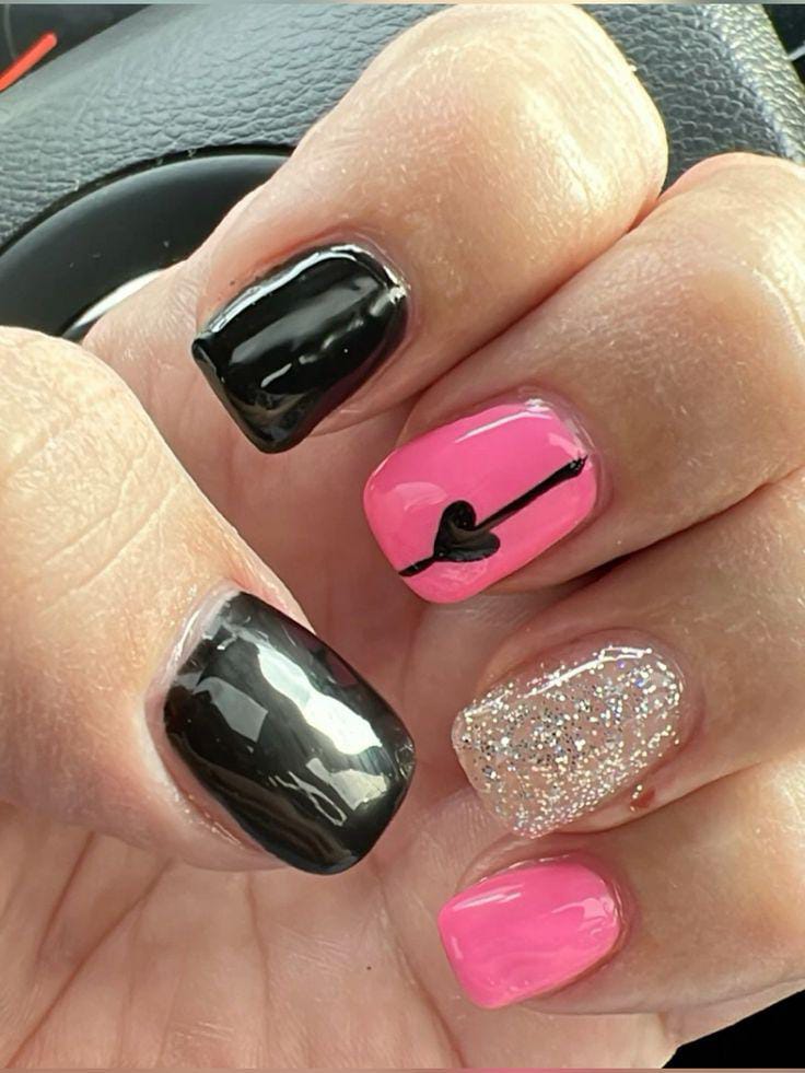 This design combines black, hot pink, and silver glitter nails for a glamorous finish. It gives off a bold, festive Valentine’s vibe with a touch of sparkle.