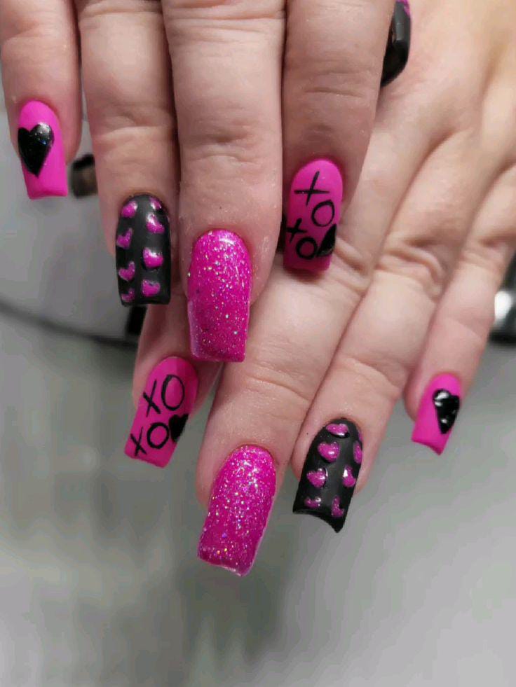 Bright pink and black nails are decorated with hearts, glitter, and playful “XO” lettering. The design feels bold, fun, and full of classic Valentine energy.